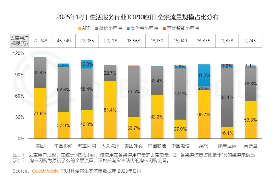 1.2 生活服务头部应用多依赖小程序引流,微信小程序成核心流量入口,全景协同效应显著