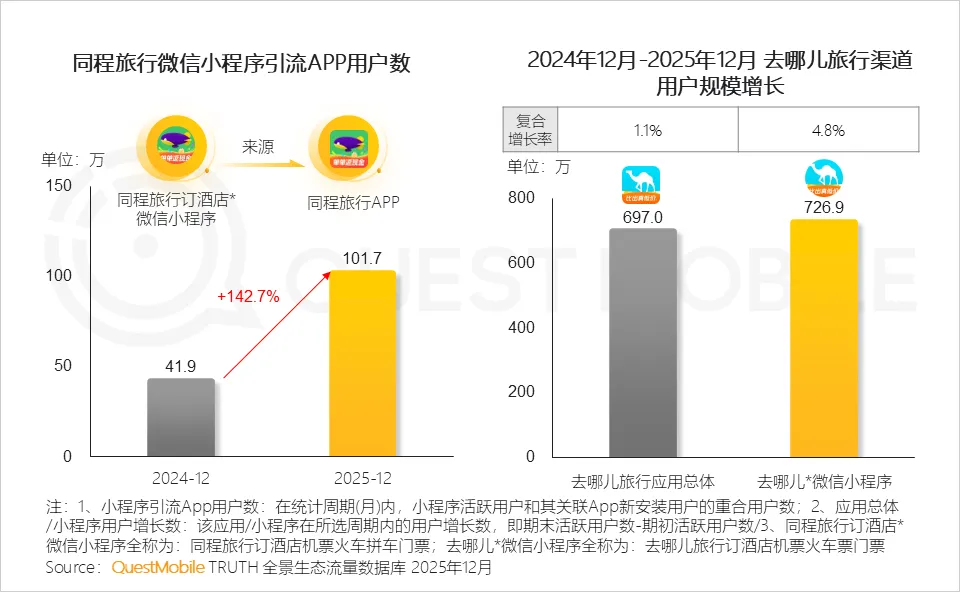 同程旅行通过微信小程序实现高效率APP转化,去哪儿旅行通过微信小程序实现用户规模持续扩张。