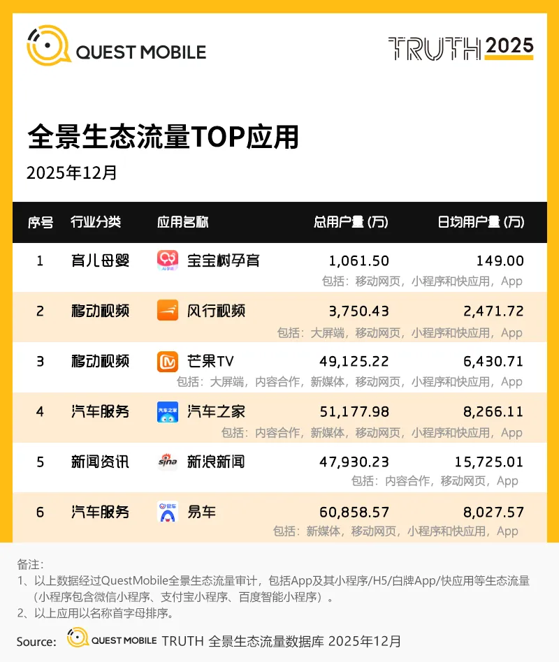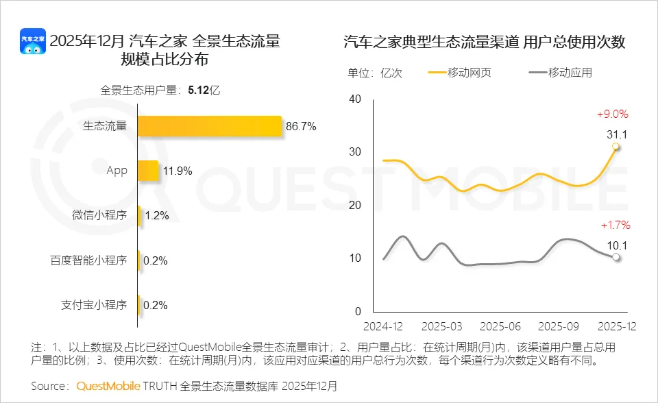 QuestMobile数据显示,2025年12月,汽车之家全景生态总体用户规模达5.12亿,生态流量占比达86.7%,其中,移动网页端用户高频使用,总使用次数达31.1亿次,同比提升9.0%。