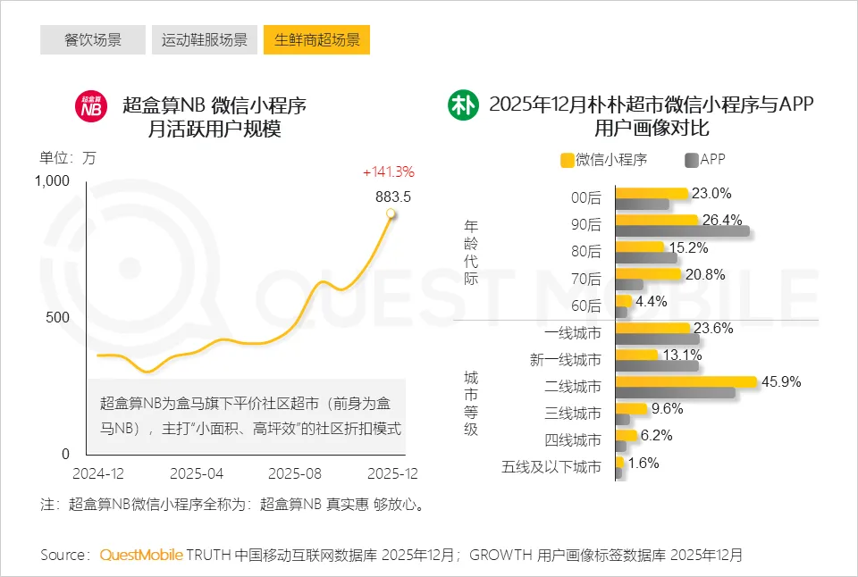 5、盒马旗下超盒算NB微信小程序爆发式增长,切入社区消费场景;朴朴超市通过双端运营覆盖多元人群