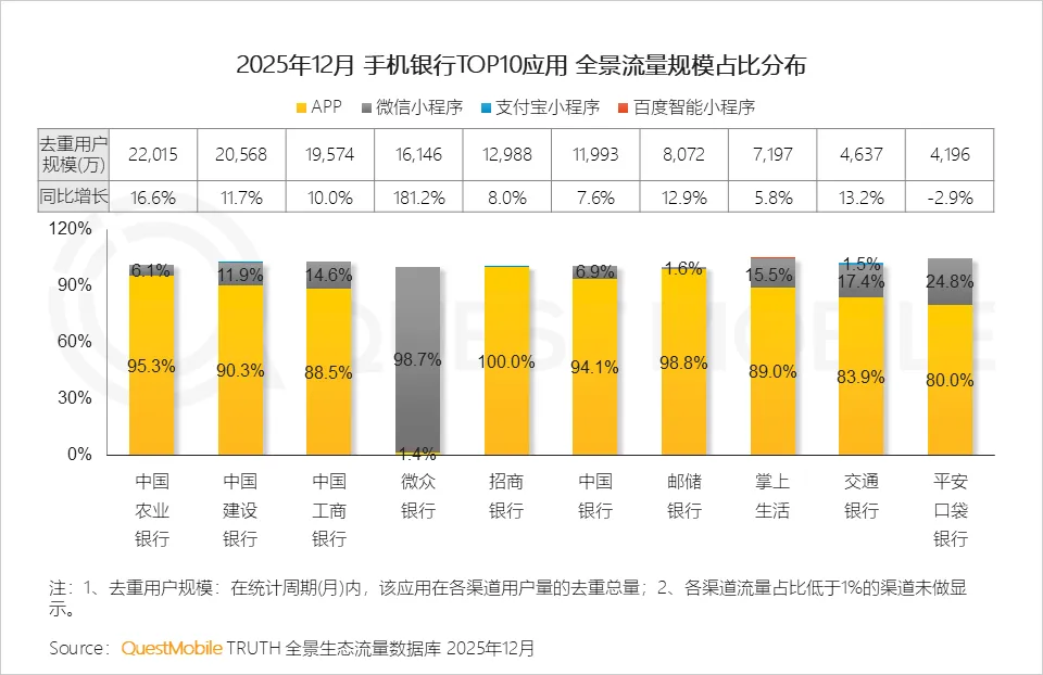 手机银行差异化发展路径显现,新型互联网银行以微信小程序作为主阵地,打造轻量级数字银行;国有大行及股份制银行以APP为流量核心,逐步加大小程序投入,探索多渠道融合