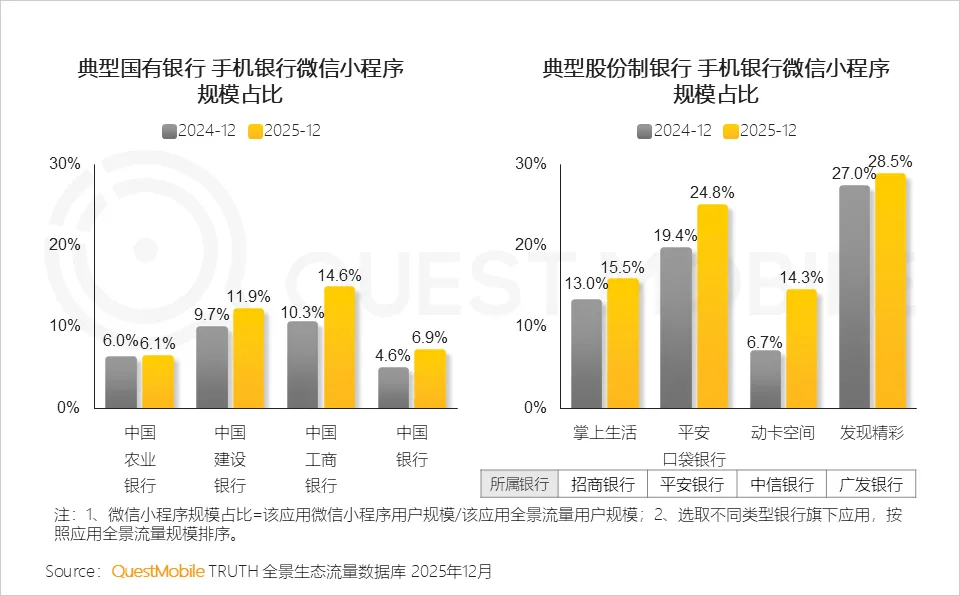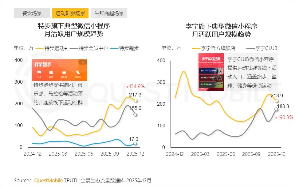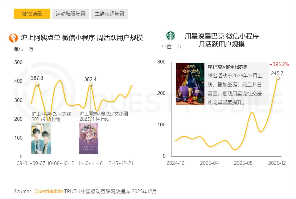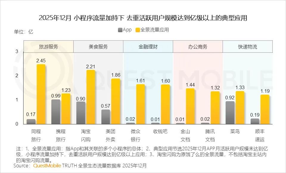 小程序已成为传统App的重要补充渠道,尤其在旅游、美食、金融、办公及快递服务类场景中,通过轻量化触达、跨平台分发,有效扩大了用户覆盖面, QuestMobile数据显示,截止2025年12月,同程旅行、淘宝闪购全景流量均超2亿。