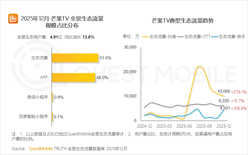 2.2 芒果TV生态流量占比超50%,抖音、快手等短视频渠道,OTT大屏端流量成为其重要增量引擎,全域分发能力持续增强
