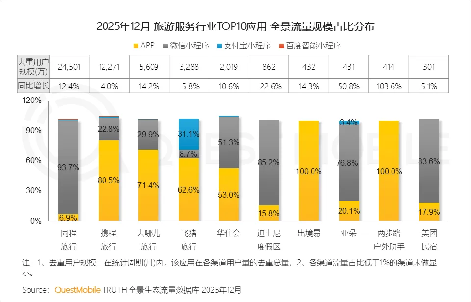 携程旅行、去哪儿旅行等以APP端流量为主,同程旅行凭借微信生态获得超2.4亿流量,飞猪旅行依托阿里生态实现多渠道协同。
