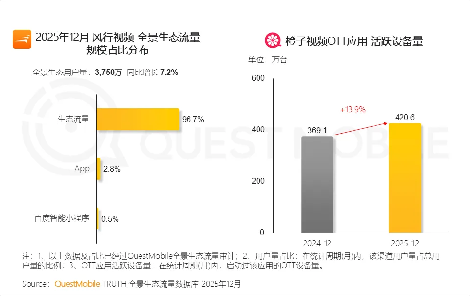 2.3 风行视频以生态流量为主导,旗下橙子视频OTT应用活跃设备量稳步增长