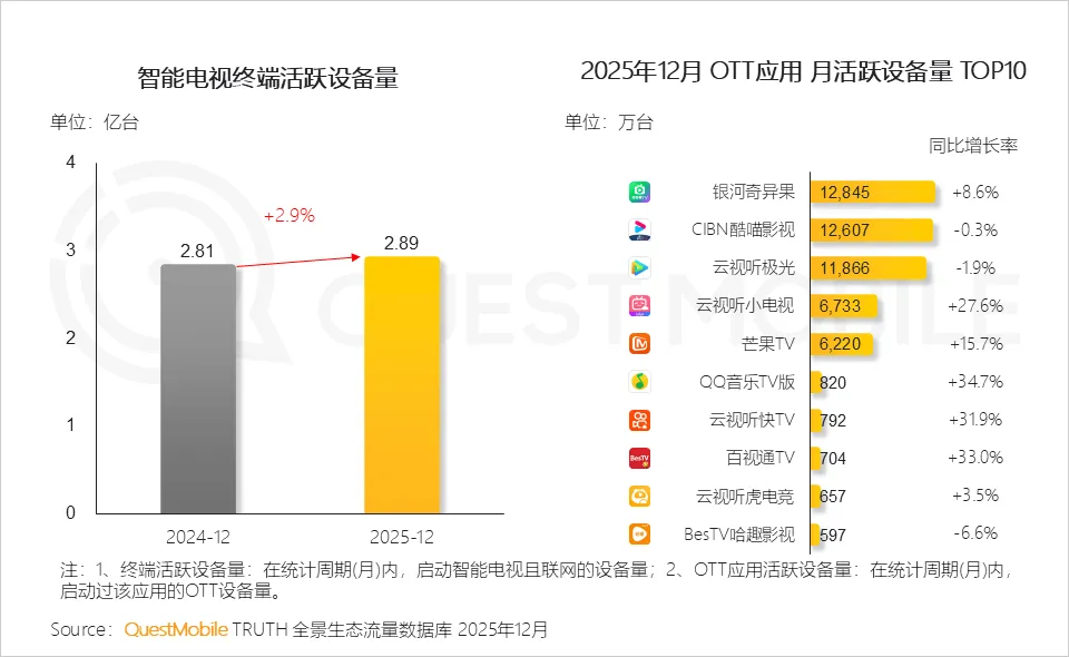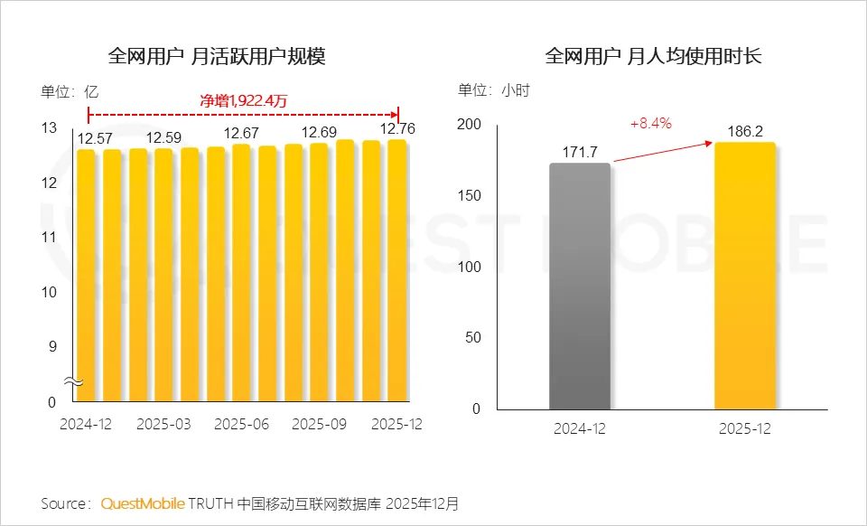 QuestMobile数据显示,2025年12月,全网月活跃用户规模已达12.76亿,用户月人均使用时长达186.2小时,同比提升8.4%。