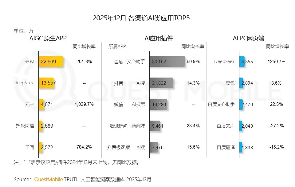 QuestMobile数据显示,2025年12月,AIGC APP行业月活跃用户规模净增量超2亿,MAU同比增速达150.4%,均位于细分行业首位,除独立原生APP外,AI应用插件也展现出强劲增长势头,月活跃用户规模达到6.96亿,同比增速达37.8%。