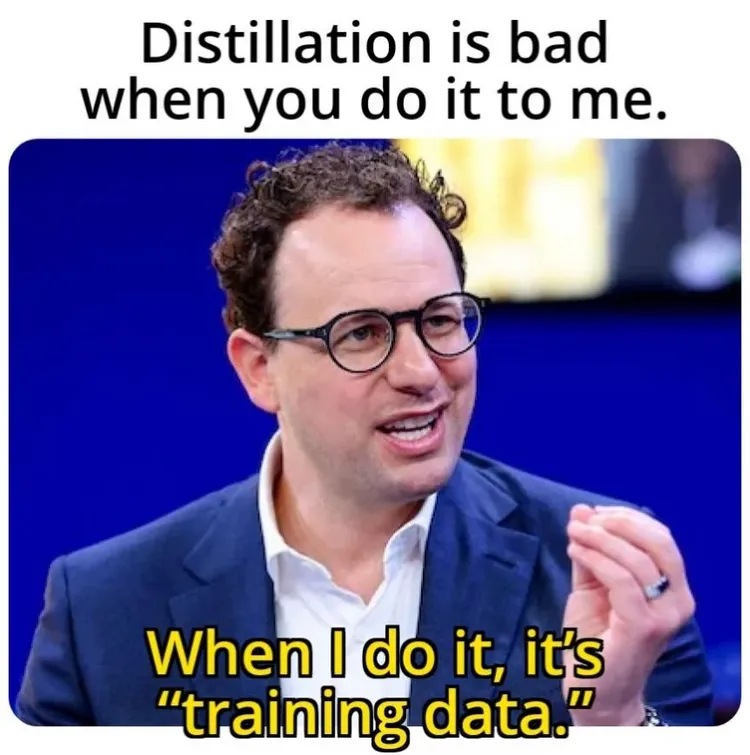 一是数字夸张。“工业规模”的24,000账户和1,600万次对话,在中文互联网语境下不过是中等规模的数据采集。一位X用户制作了广为流传的meme图:“当你做的时候叫蒸馏,当我们做的时候叫训练”(Distillation when you do it. Training when we do it),精准戳破了其双标。