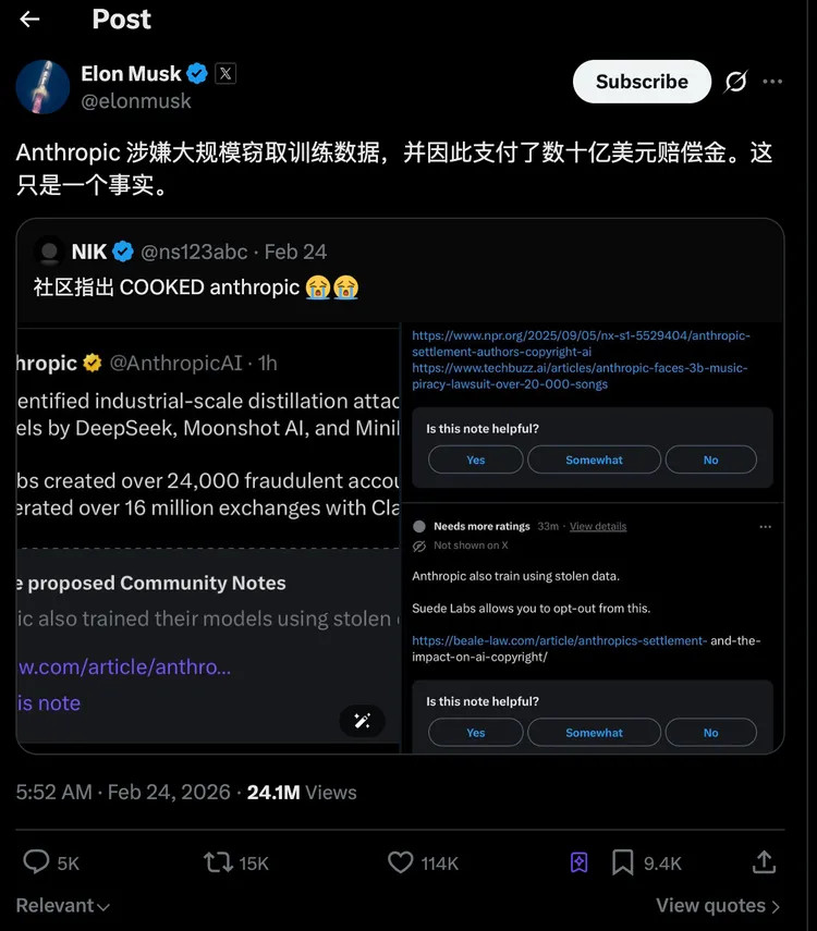 马斯克的开场最具杀伤力。这位 xAI 创始人在 X 上写道:“Anthropic自己就是大规模窃取训练资料的罪魁祸首,他们甚至为此支付了数十亿美元的赔偿和解金。这是铁一般的事实”。