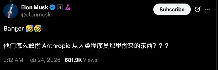 埃隆·马斯克(Elon Musk)在 X 上的嘲讽最具代表性:“他们怎么敢偷 Anthropic 从人类程序员那里偷来的东西?”