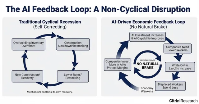 这次的起因,是2026年2月23日,美国一家独立研究机构Citrini Research 发布了名为《2028 年全球智能危机》(以下简称《智能危机》)的报告。这篇报告(或者说是经济推演),在极短时间中完成了病毒式传播,直接引发了美股科技股集体暴跌。在国内社交媒体上也得到了迅速发酵,引起剧烈讨论。