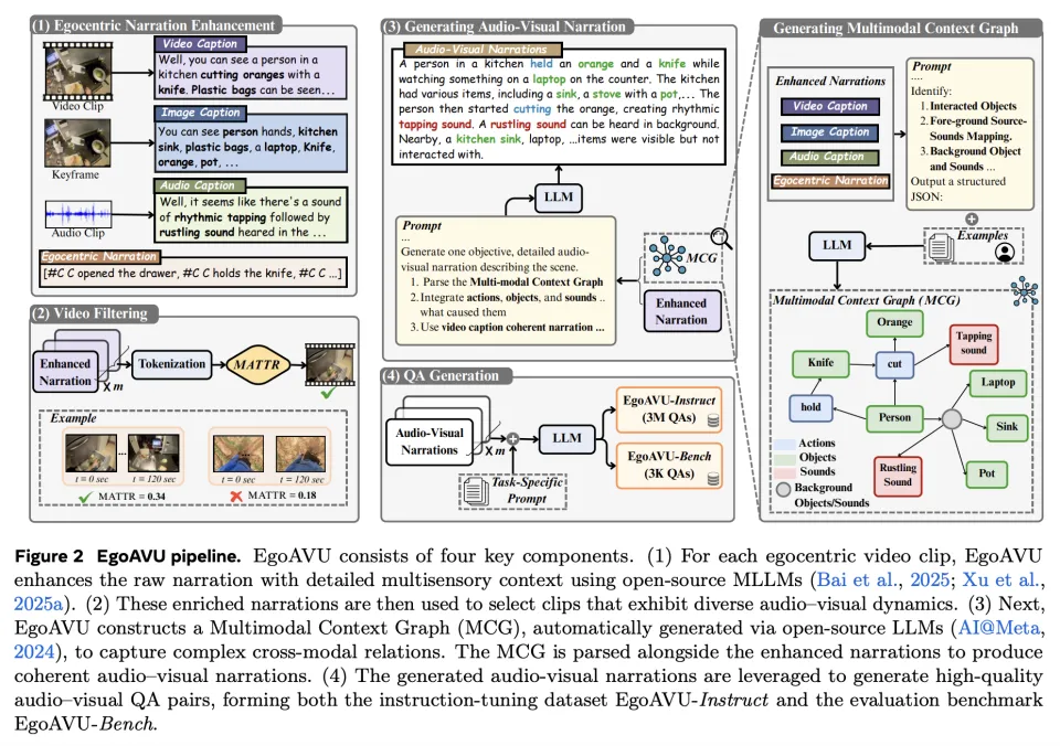 EgoAVU是一个完整的数据生产系统,可以自动理解视频中的声音-视觉关系、自动生成高质量问答与叙述数据、自动筛选最具跨模态信息的视频,最终形成可规模扩展的数据流水线。