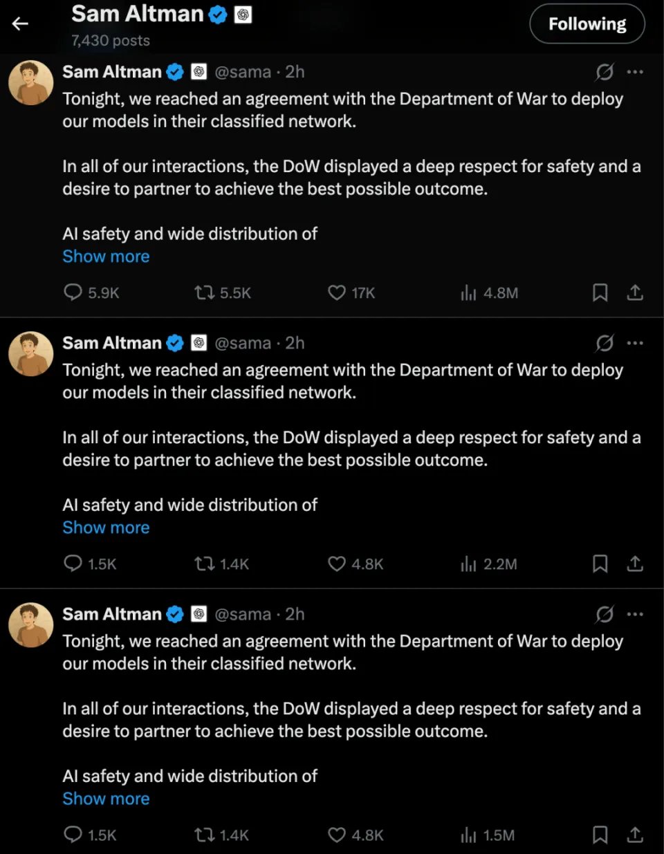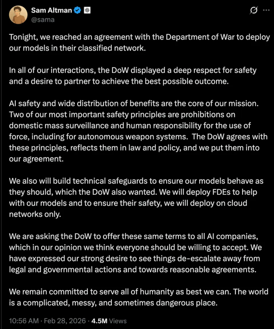 可刚刚,奥特曼在 X 上连发三条相同的帖子,宣布 OpenAI 已与美国五角大楼达成协议,将模型部署到他们的机密网络中。