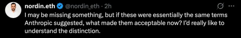 还有网友追问,「如果这些条款本质上和 Anthropic 之前提出的差不多,那现在为什么就变得可以接受了呢?我真的很想搞清楚其中的区别到底在哪里。」