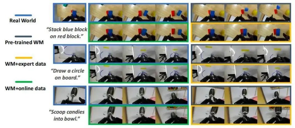 研究团队用包含成功与失败的真实机器人在线轨迹数据微调预训练世界模型;同时为了防止模型过拟合,还加入了原始的 DROID 数据集一起训练,让它既能看懂失败,又不会过拟合,确保对真实场景的还原度。