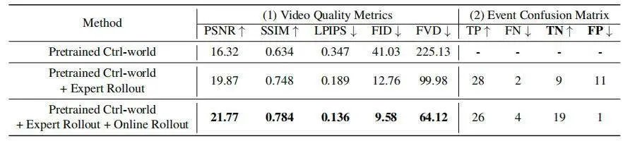 1. 经过真实试错数据微调后的世界模型,在 PSNR、SSIM 等视频质量指标上,全面超过了原始预训练模型,以及仅用专家成功数据微调的模型,生成的视频画面更贴合真实;