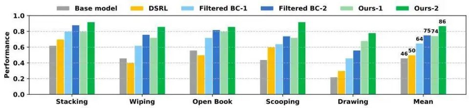 研究团队在 DROID 机器人平台上,针对堆叠积木、打开书本、擦除白板标记、舀取颗粒、画圆五类复杂任务做了实测 —— 这些任务都涉及频繁的物理接触或可变形物体操作,是传统仿真模型很难建模的场景,也正是检验世界模型实用价值的关键场景。实验用当前 SOTA 的 π0.5 作为基础策略,Ctrl-World 作为基础世界模型,每轮迭代在 5 类任务上共收集 250 条真实轨迹(每类任务 50 条)用于世界模型的校准,而经校准后的世界模型,最终交出了一份亮眼的成绩单,支撑机器人策略在五类任务中实现成功率的大幅提升。从整体表现来看,各方法的成功率提升对比结果清晰显示 VLAW 的优势。