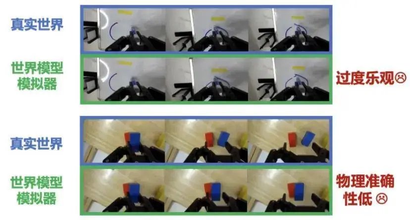 盲目乐观:训练数据大多是成功的动作轨迹,没见过失败案例,导致模型预测的结果全是「理想情况」,根本还原不了真实操作中的失误和意外,无法贴合真实的操作场景;
