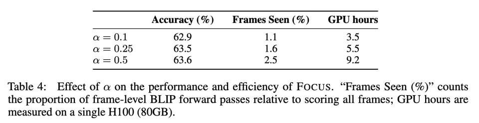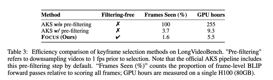 结果表明:在长视频场景(例如 >20 分钟 的设定)下,FOCUS 相比均匀抽帧带来最高 11.9% 的性能提升。同时,FOCUS 在不依赖降采样等预过滤手段的情况下,平均仅需观察 <2% 的帧即可达到上述收益,显著降低了关键帧选择与推理阶段的总体计算开销。
