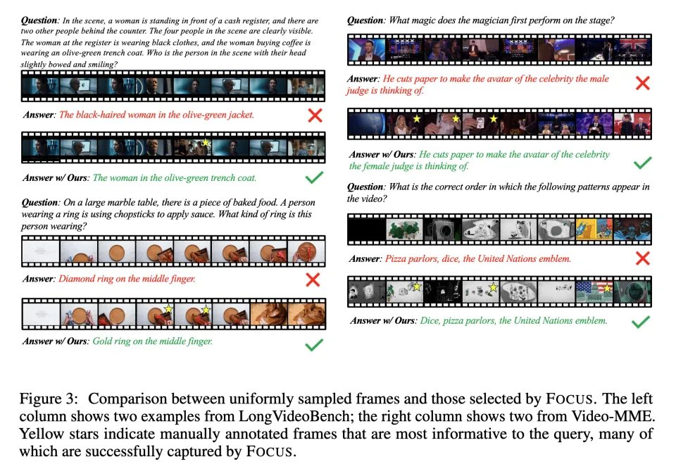 作者对若干典型样例进行可视化分析:在长视频中,FOCUS 通过两阶段探索快速将注意力收敛到少量高价值片段,再在片段内部挑出证据帧,使得输入给 MLLM 的帧更 “信息密集”,从而提升回答质量。
