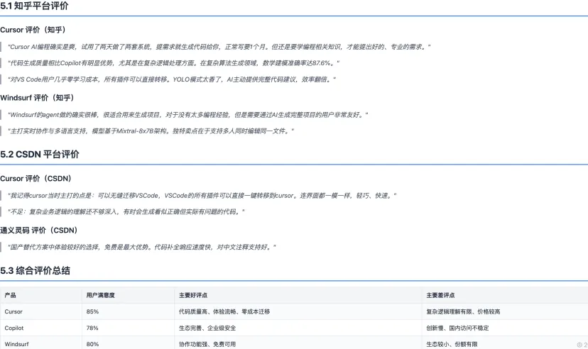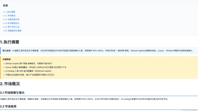 这是最终的报告成果,可以看到,整体条理非常清晰,包含执行摘要、市场概况、玩家分析、用户评价等 6 大模块,不仅精准提炼了 GitHub Copilot(2000 万用户、180 万付费用户)、Cursor(90 亿美元估值、21 个月 ARR 从 100 万到 1 亿)等核心数据,还对三款主流产品做了优势 - 劣势 - 用户满意度的结构化分析,甚至能精准总结出 Cursor 数学建模准确率 87.6%、通义灵码中文注释支持好等细节。