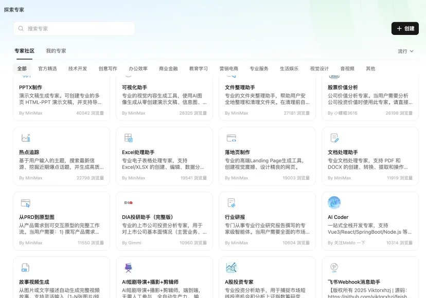 当然,用户不仅能自由创建 Expert,还能将自己的 Expert 开放共享。目前,MiniMax 已经构建起了一个充满活力的 Expert 生态:已有1 万 + 公开的专家 Agent,其中大部分来自 UGC 创作,甚至包括投研分析、行业报告、代码开发等高质量的专业 Agent。