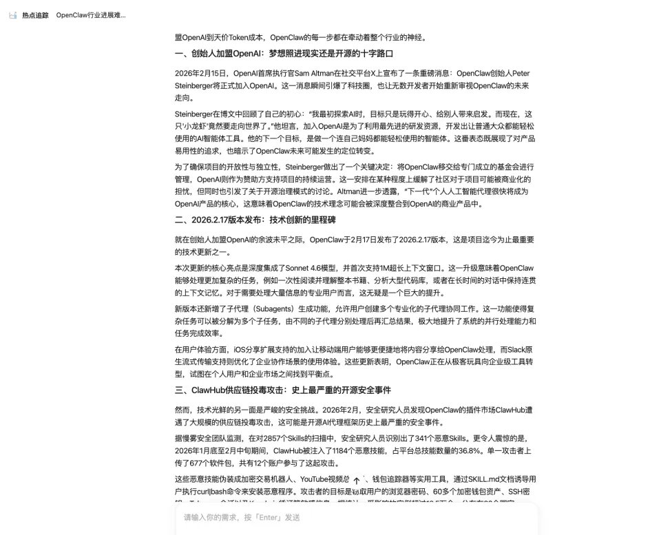 我们让它搜寻 OpenClaw 项目的最新进展,AI 自动拆解为最新动态、技术特点、社区讨论、行业影响四个板块,不仅搜集了 2026 年 2 月的版本更新、功能发布等最新信息,还梳理了开发者社区的热点争议和对 AI 智能体领域的影响。