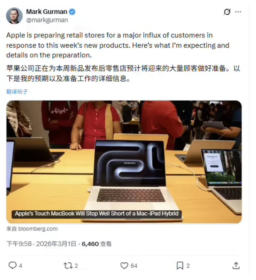 3 月 1 日,彭博社记者马克·古尔曼带来最新前瞻,曝光了更多的苹果未来产品线及下周发布会细节。