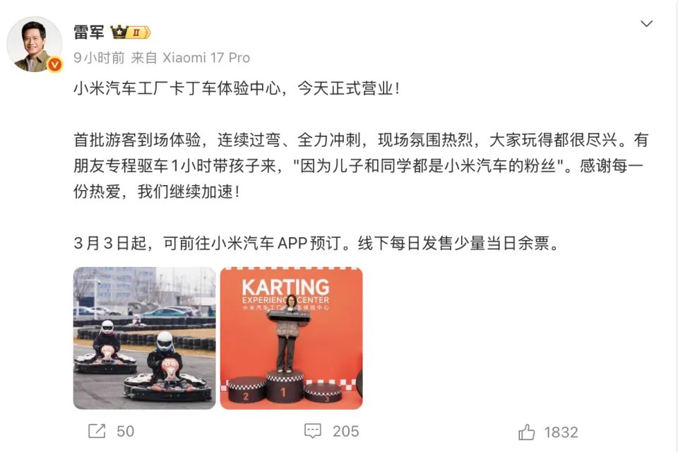 雷军宣布:小米汽车工厂卡丁车体验中心正式营业