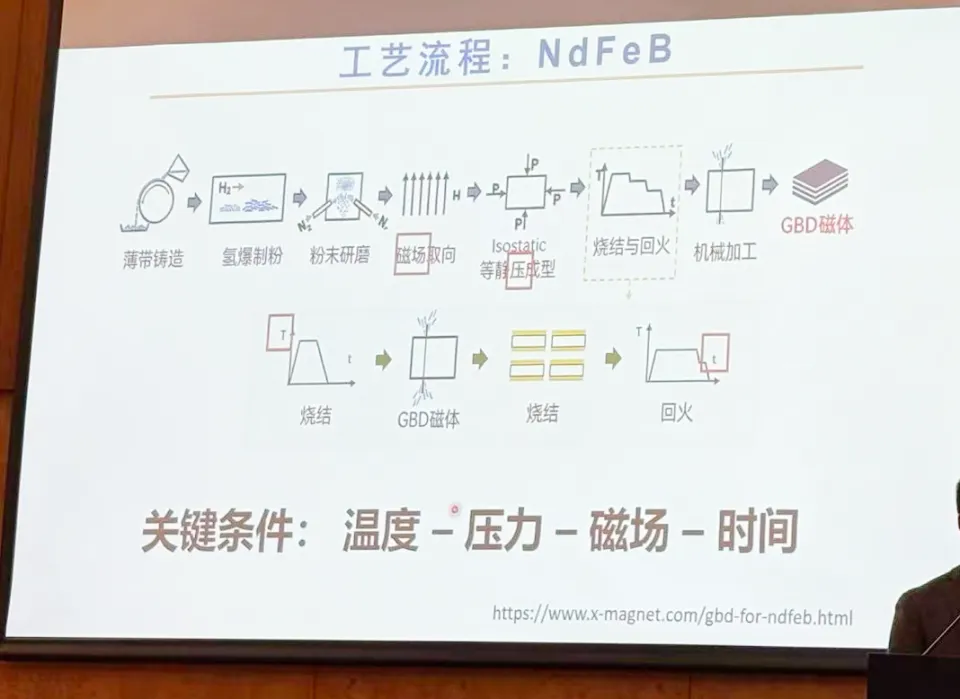 以钕铁硼(NdFeB)永磁材料的制备为例,其生产工艺包含了薄带铸造、磁场取向等环节,其中温度、压力、磁场和时间是影响最终磁体的微观结构和宏观性能的关键因素,且磁性能是从原子级到宏观级(1mm)的多层结构共同决定的,任何一个尺度上的结构缺陷,都会影响最终的性能表现。