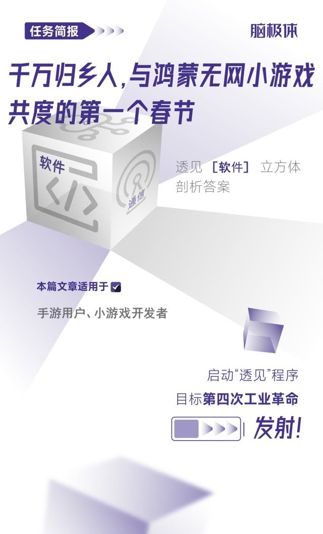 飞驰的春运车厢中,手机信号经常失联,网络不稳定,一些归乡的人不再只能埋头反复刷新加载失败的短视频,打开华为小游戏,连上提前缓存的《狙击外星人》《太吾促织谭》等,不需要下载安装,哪怕是飞行模式,游戏也能流畅地跑起来,打发旅途中的无聊时光。