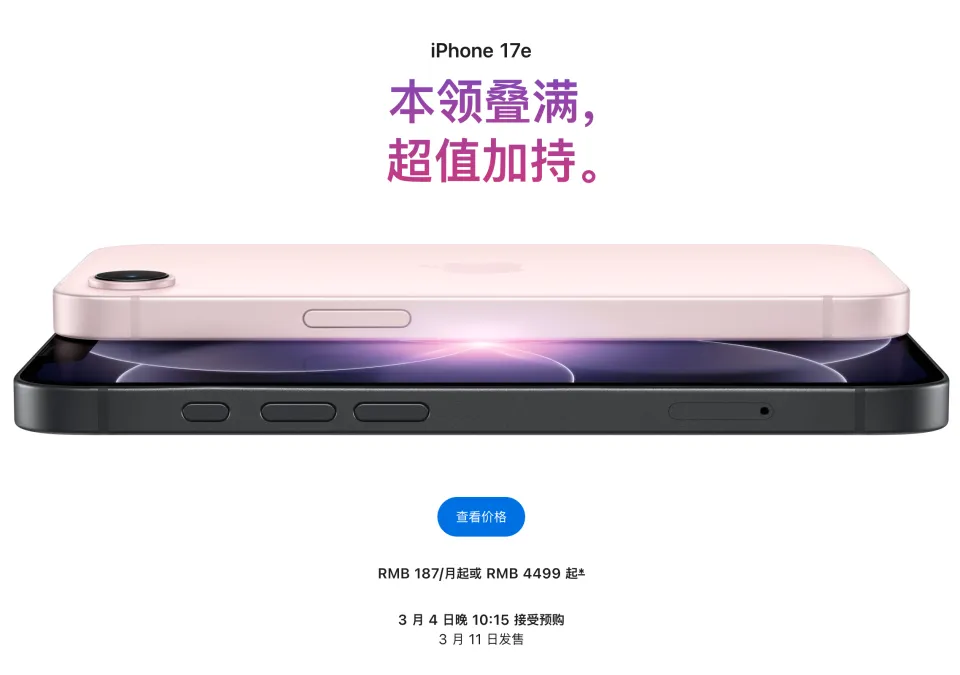iPhone 17e起售价为4499元人民币,存储容量从256GB起,双卡(可激活两个eSIM,或一个nano-SIM卡和一个eSIM),3月4日晚10:15接受预购,3月11日正式发售。