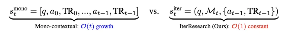 从上下文管理的视角看,传统 ReAct 的状态空间随交互轮次 t 线性增长(O (t)),而 IterResearch 的工作空间始终保持恒定(O (1))。