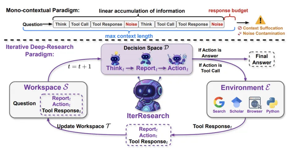 IterResearch 对这一问题的回应不是修修补补,而是从范式层面重新思考:与其不断往上下文里塞东西,不如让 Agent 学会「边做边清理」。