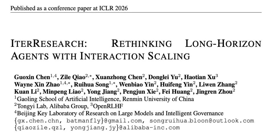 ICLR 2026|人大&通义:别再只会堆上下文了!IterResearch用40K上下文轻松实现2048轮交互不退化