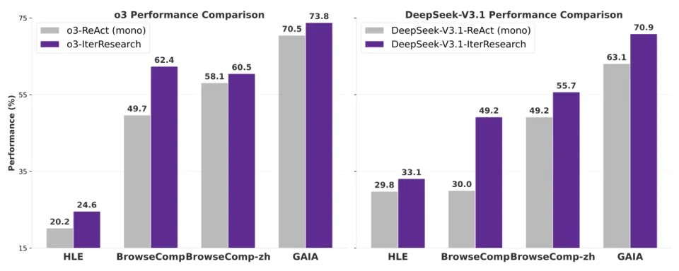 研究团队在 o3 和 DeepSeek-V3.1 上做了验证。在完全相同的任务设定下,相比传统的 ReAct 提示范式,IterResearch 在最具挑战性的 BrowseComp 上分别为 o3 带来了 12.7 个百分点、为 DeepSeek-V3.1 带来了 19.2 个百分点的提升。