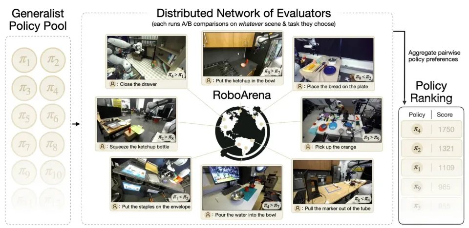 RoboArena 是一个基于 Droid 构建的分布式真实世界基准测试。全球各地的评测者拥有相对相似的机器人和实验设置,并根据不同的自然语言指令,运行一系列开放式的机器人任务评测。