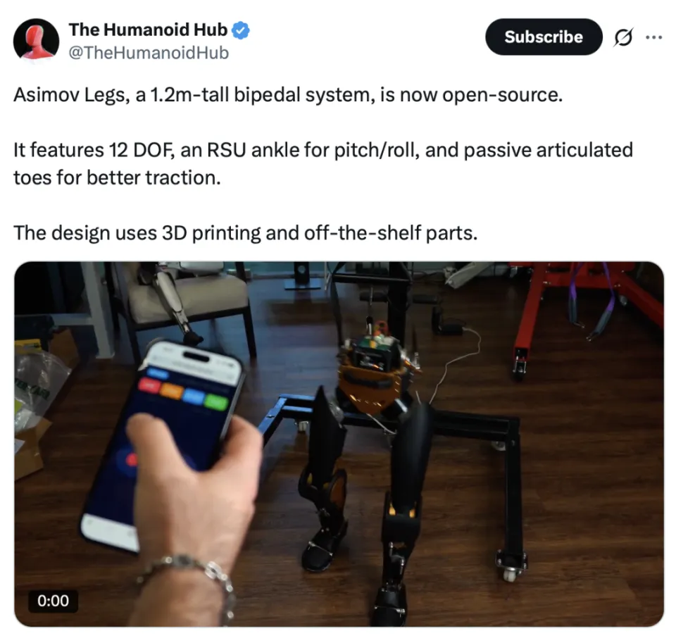 值得一提的是,Menlo Research 的明确目标是打造增强人类能力的劳动力平台。从起步阶段,Asimov 机器人就以“公开构建”的方式推进,目前已开源了其双腿模块设计和仿真文件,并在 Discord 社区中持续更新进展。