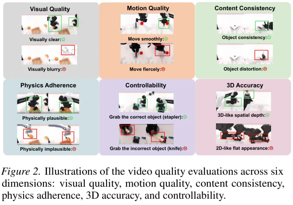 通过比对文本指令和最终生成的视频内容,系统会打分判断机器人有没有认错目标物体,有没有执行错误的动作类型。这就像在考核一个员工是否精准理解了老板的任务分配。