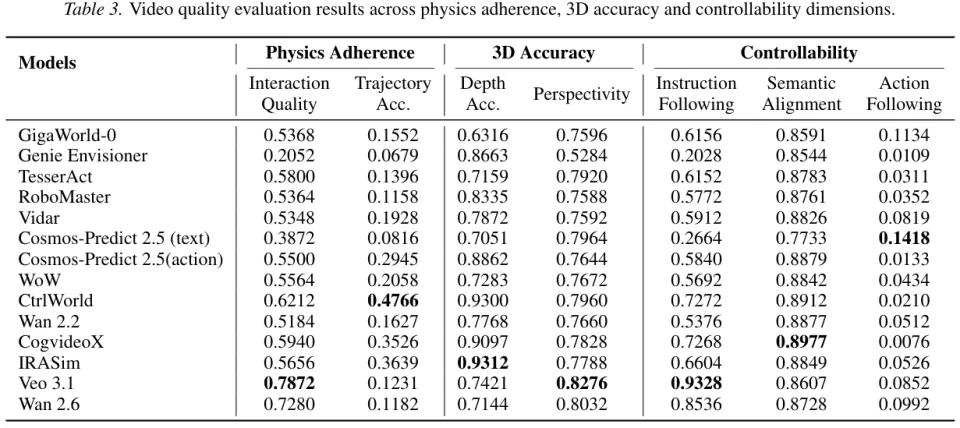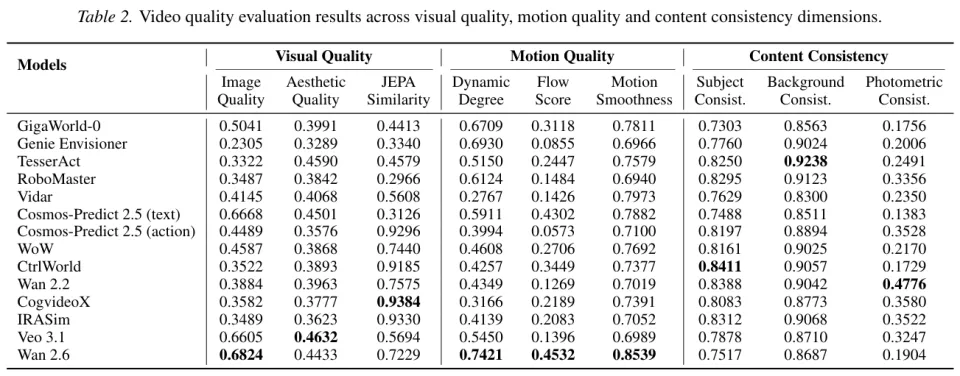 这得益于它们专门针对机械臂动态特性的训练。Veo 3.1 和 Wan 2.6 这两位商业选手毫无悬念地摘取了视觉和美学分数的桂冠。