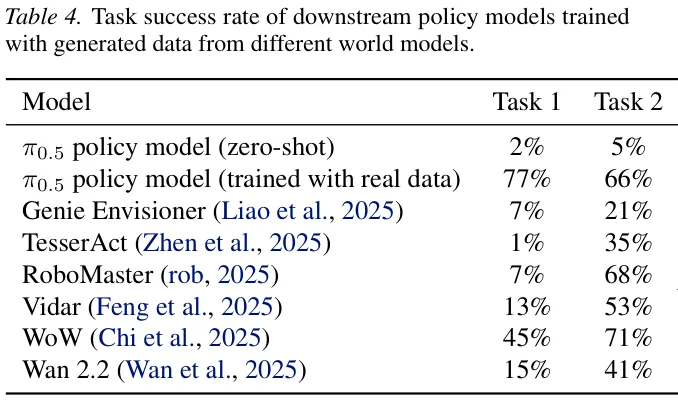 拿这些合成教材去教一个新的机器人,新机器人的任务成功率提升了多少,就是世界模型当引擎的成绩单。
