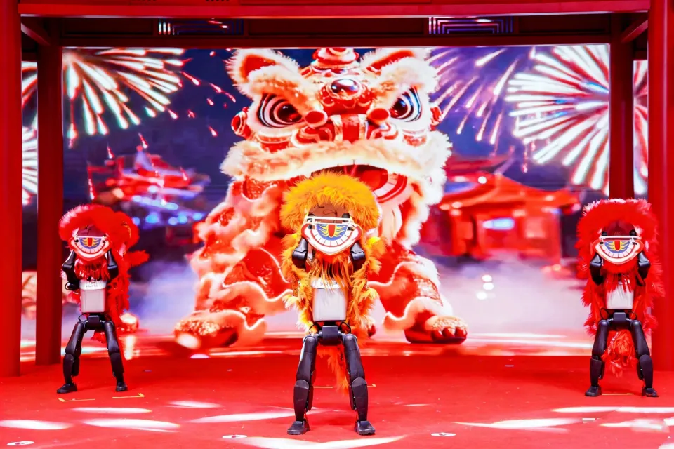 于是,极具反差感的一幕幕在全国各地上演:在村头的泥地上,它和孩子们踢足球;在宗祠里,它双膝着地祭祖;在光滑的地板上,它模仿迈克·杰克逊的太空步;大年初一的乡村大集上,它披上行头演起传统舞狮,成了小镇的“顶流明星”。科技的冰冷感,在这些极具反差的场景中消弭。