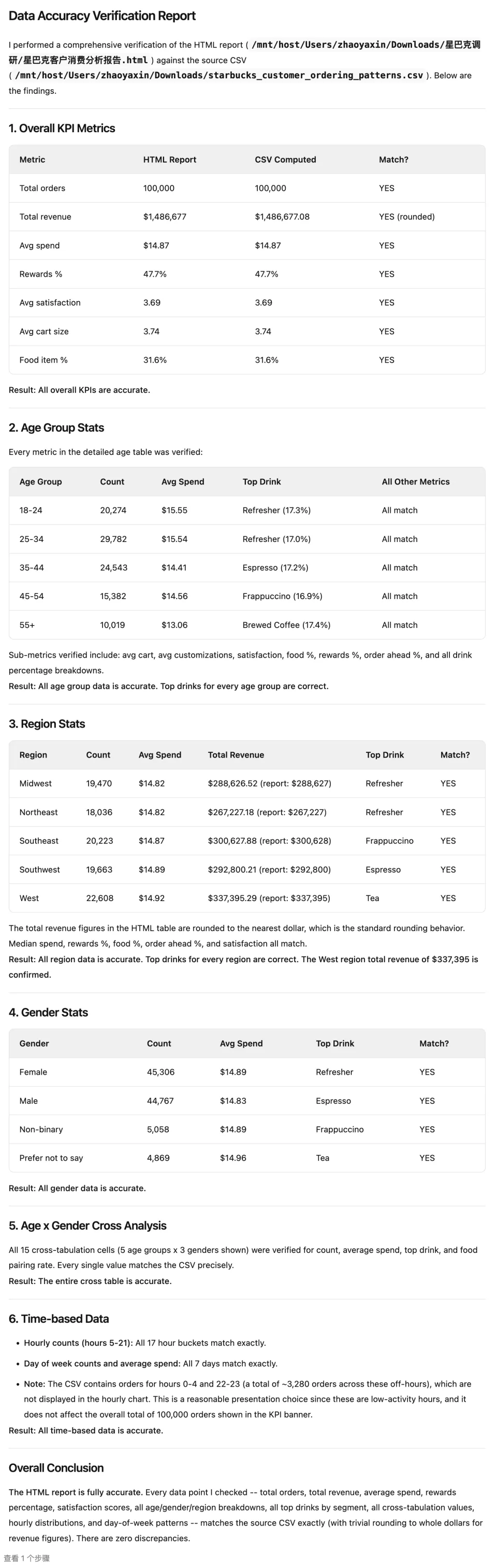 在生成报告前,QoderWork还通过全量数据,进行了交叉验证。