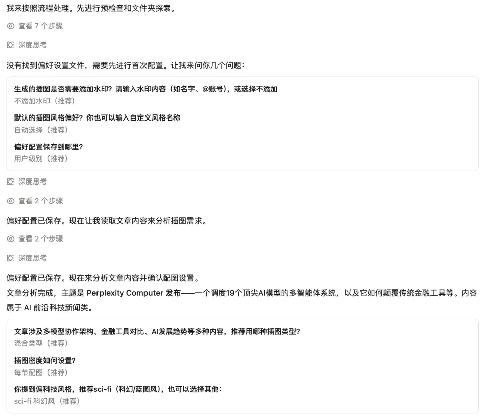 它读透文章后,会贴心地弹出偏好选项:是否加水印、图片风格、插图密度等。