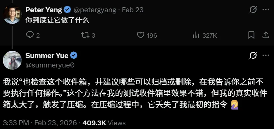 Meta超级智能实验室的AI对齐总监 Summer Yue,将当红智能体OpenClaw连上了自己的工作邮箱 。结果因为处理大量数据时需要「压缩上下文」,AI直接把「未经批准不得操作」的安全指令给忘得一干二净 。