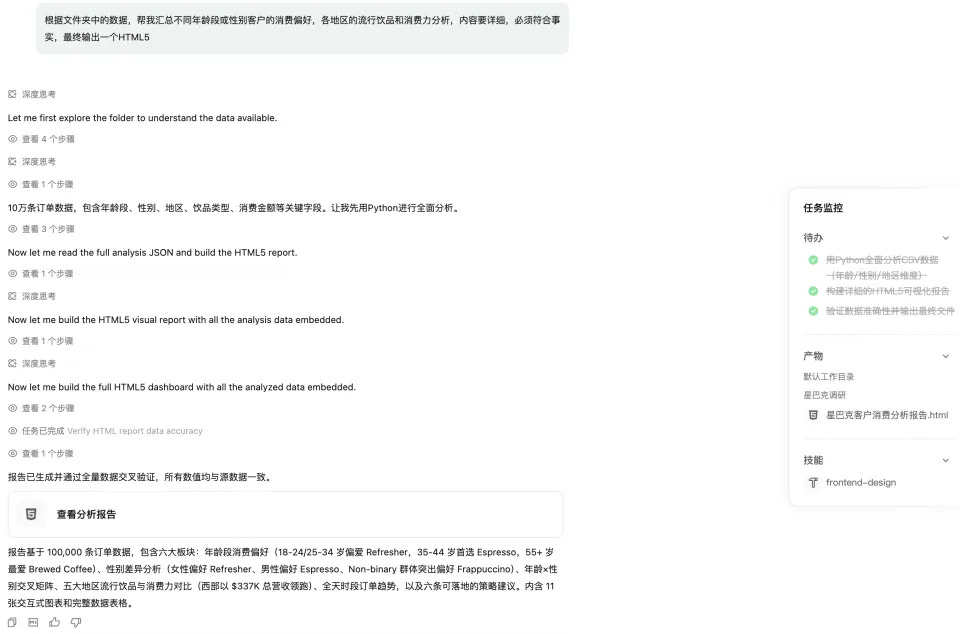 选中文件夹,然后让其汇总不同年龄段/性别客户消费偏好,以及各地区流行饮品和消费力的分析。