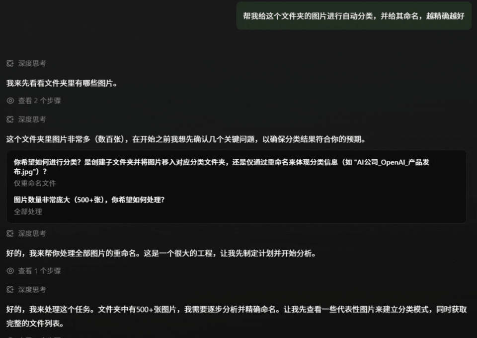 只见它有条不紊地拆解出执行指令,不仅能精准识别每张图片的内容,还能自动编写脚本完成批量重命名。