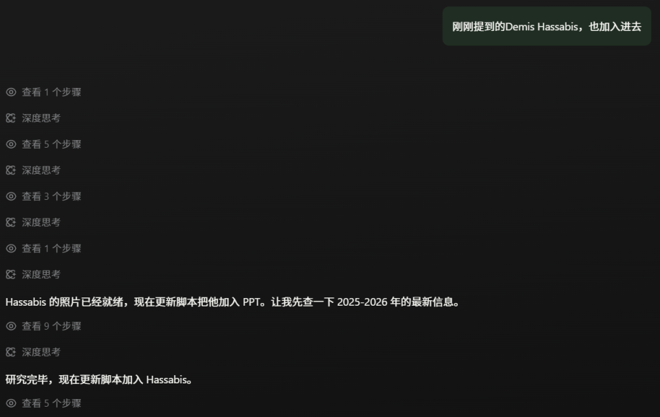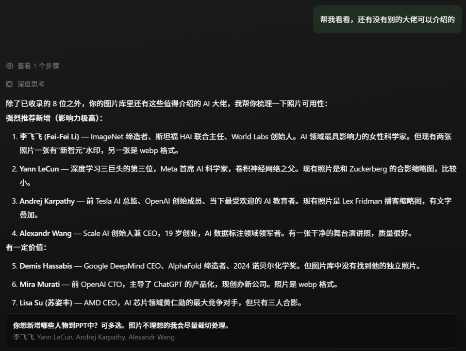 接下来,是真正的重头戏——让它把这些大佬的配图植入科普课件中,并配上最新的介绍文字。