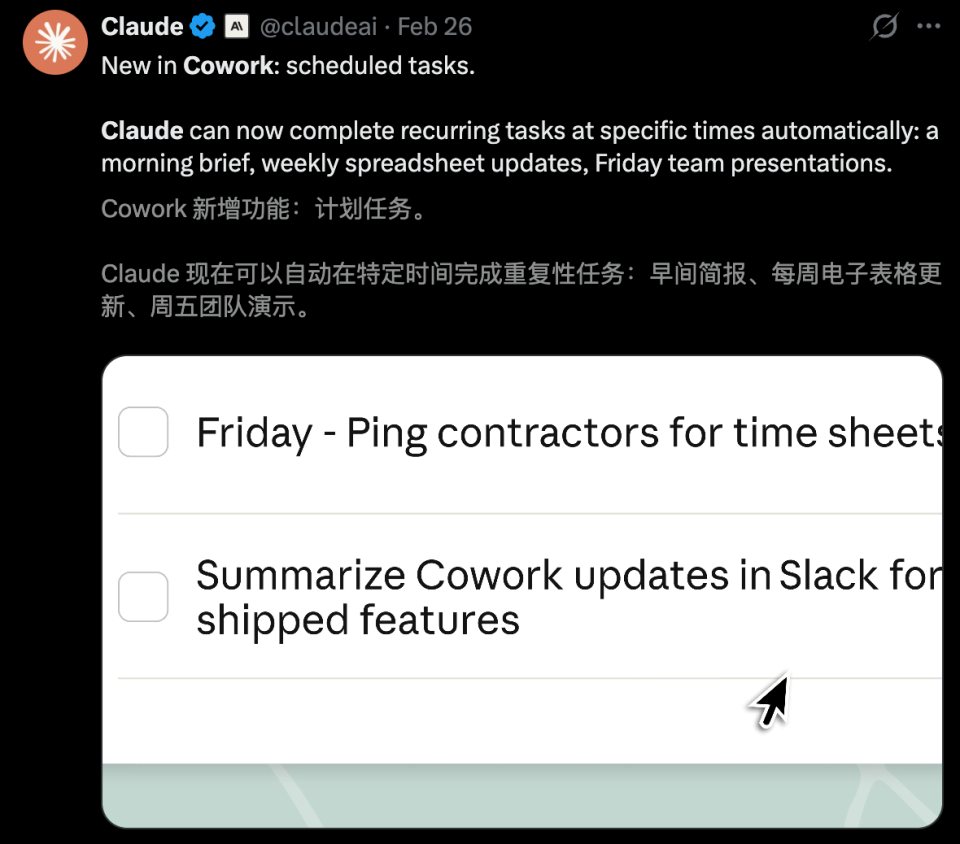 仅上线两月的Claude Cowork,刚又祭出全行业插件与「定时任务」功能,让枯燥的机械重复劳动彻底步入「自动驾驶」。