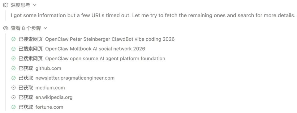 令人惊喜的是,除了参考链接,它还能联网搜集最全的关于OpenClaw一系列信息。